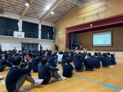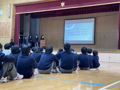 本日4時間目、校外学習の学年発表会を実施しました。秋の校外学習の事後学習として行った班発表で、それぞれのクラス代表となった班が、学年全体に向けて発表するものです。