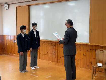 2学期の最終登校日です。寒い朝でしたが、教室に着席し、リモートによる全校集会を行いました。式前の伝達表彰では、たくさんの教科・部活動・コンテスト等の表彰を行いました。いこいの間で実施した「箸使い選手権」の表彰も行いました。音羽中学校の生徒が、さまざまなところで活躍していることを、とても嬉しく思います。(一部を本日発行の学校だよりに掲載しています。)