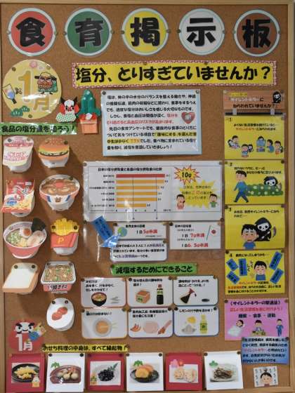 職員室前に食育掲示板があります。1月のテーマは「塩分、とりすぎていませんか?」です。塩分の多い食事を続けていると、高血圧などの生活習慣病になる確率が高くなります。私自身も食事の際、何にでも醤油をかけてしまっているなぁと反省しきりです。自身が摂っている塩分量を知り、減塩を意識していきましょう。