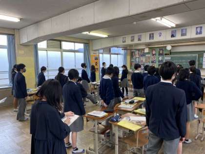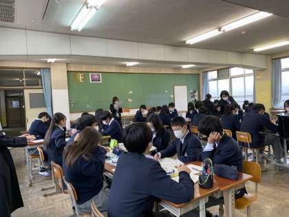 1番は、平和を表す「春」の場面。お城で行われる花見の宴の様子は華やかですが、時の流れと共に滅びゆく「栄枯盛衰」が描かれています。授業では、一人一枚ずつのホワイトボードを活用し、前時の復習、歌い方の工夫(自分の意見)、意見交流などを行い、歌の世界を深めていました。色々な意見が出て、とても面白い授業でした。