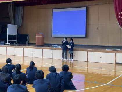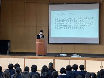 本日6限、1年生で学年集会が行われました。はじめに、夏休みに実施された「北方領土青少年等現地視察事業」の参加生徒より、発表がありました。北方領土のすぐ近くまで行き、日々この問題と向き合う方々の話を聞く経験を通して、「印象に残っていること」「今、実践していること」「自分たちに出来ること」などを発表しました。