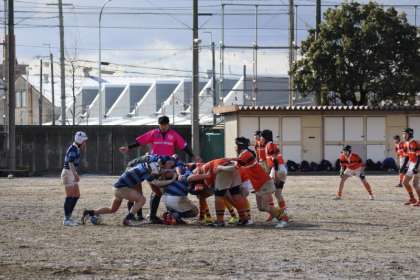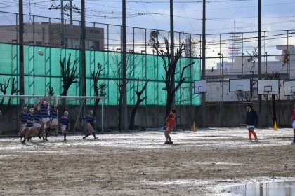 試合後半、最初の得点は相手校。0対10と点差が広がります。しかし、あきらめなかった音羽。2年生選手が個人技で抜出し、得点を挙げ5対10。試合終了間際まで全員ラグビーで攻め、2本目のトライが決まり、そのまま最終コンバージョンゴールを決め、最終12対10で逆転勝利!!選手一同、応援する全ての人が、興奮と勝利の喜びを味わう試合でした。次回の試合は、2月4日(土)、西京極補助グラウンドで行われます。