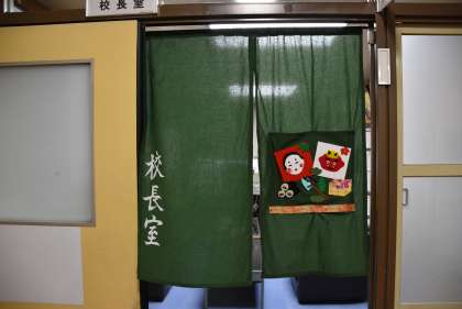 校長室の入口には,家庭科部の皆さんにつくってもらった暖簾が掛かっています。図柄の部分は,月毎に取替えられるようになっています。