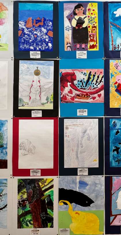 絵画のテーマは、名画や名作のオマージュです。オマージュとは「尊敬する作品に影響を受け、似た作品を創作すること」。自分で作品を選び、美術の時間を使って仕上げました。どれも個性がよく出ています。(写真は制作風景と美術館展示の様子)