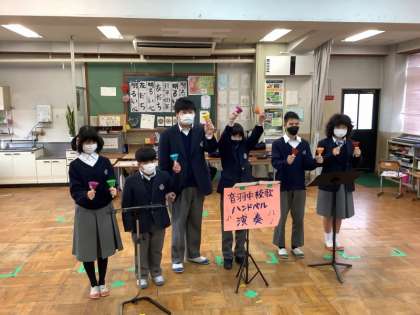 発表の最後は、音羽中のハンドベル演奏。校歌を、10個のハンドベルを使って演奏します。テンポが速く、苦労もありましたが、完成度の高い演奏だったと思います。