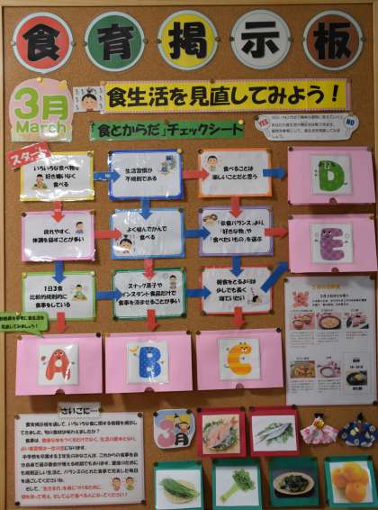 職員室前に食育掲示板があります。3月のテーマは「食生活を見直してみよう!」です。食事は、健康な体を作るだけではなく生活の基本となり、良い食習慣は一生の宝になります。自身の食生活を振り返り、できるところから改善していきたいものです。
