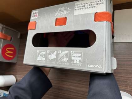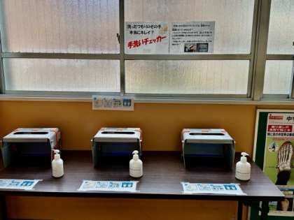 保健室前に手洗いチェッカーコーナーを設置しました。「手洗いチェッカー」は、専用のローションをつけて、ブラックライトに手をかざすと、洗い残しが光り、普段は見えない洗い残しが目に見えてわかるしくみです。