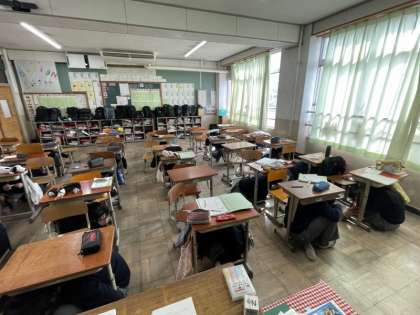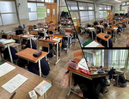 地震の際、どうすれば自分の身を守ることができるでしょうか。基本は「頭を守り」「動かない」。机の下に入り、頭を守る。机がない場合も、頭を守ることを第一に行動します。短い訓練でしたが、放送と先生の指示をしっかり聞いて、取り組むことができました。今日の訓練を機会に、今一度、身の回りの防災環境を確認したいと思います。