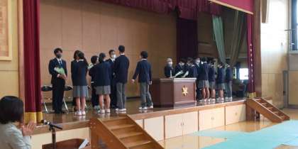 その後、生徒会代表「お別れの言葉」です。「コロナ禍で辛かった時期に先生に助けられたこと」「数々の思い出」「自分たちもがんばります」などの言葉と共に、本部生徒より花束贈呈を行いました。