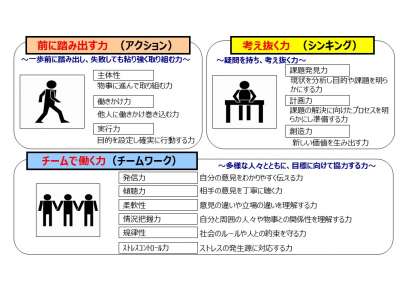 経済産業省が主催した有識者会議により、職場や地域社会で多様な人々と仕事をしていくために必要な基礎的な力を「社会人基礎力(=3つの能力・12の能力要素)」として定義されている。