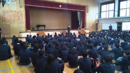 令和5年度始業式の様子です。初めに、校長先生より、4月1日以降の感染予防について、説明がありました。そのあと「今年度、全校生徒に期待する3つのこと」について、話がありました。