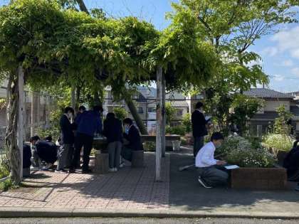 久しぶりの青空、暖かな春の陽気です。1年生の理科では、校内の植物を観察しました。前時に学習した「スケッチの仕方」「ルーペの使い方」「生き物を観察するときどんなところに注意するか」の内容を思い出しながら、観察したい植物を選びます。それをじっくり観察し、ワークシートにスケッチします。ルーペを使って、細かな部分まで、詳しく観察している人もいました。