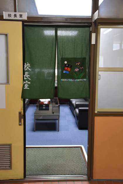 校長室の入口には,家庭科部の皆さんにつくってもらった暖簾が掛かっています。図柄の部分は,月毎に取替えられるようになっています。