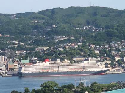 平和公園を後にして、一路ホテルへ。予定通り、ホテルに到着しました。今夜の宿泊地は「稲佐山観光ホテル」。稲佐山の中腹にあるホテルで、ちょうどクイーンエリザベス号が入港しているのが見えます。夜には、1000万ドルの世界三大夜景を楽しむことができるといいですね。