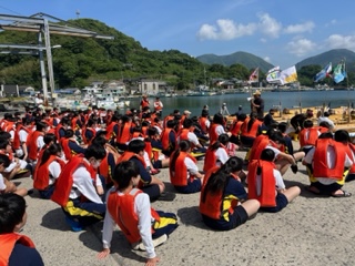 競技開始に向けて、船に学級旗を掲げました。天気も良く、爽快な風景です。スタッフさんが、注意事項を説明してくれています。みんな、話をよく聞いています。