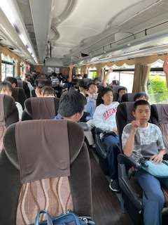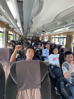 12時30分、ハウステンボスに向かって、出発しました。移動の車中では、今日も、修学旅行実行委員会さんプレゼンツのバスレク(バス内レクレーション)で盛り上がっています。 身近な先生に関するマニアックなクイズ、「知らんがなクイズ」や、先生の体の一部を見て誰か当てるクイズを楽しんでいます。