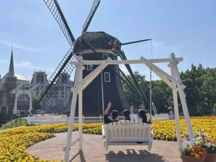 中世オランダの街並みが広がるハウステンボス。場内の建物は、すべてオランダにオリジナルが存在しているそうです。今は風が吹いていて、涼しいです。