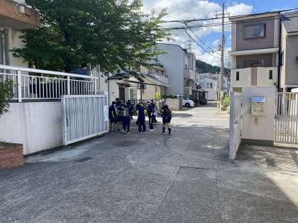 8時50分、学校出発の様子です。班ごとに、計画表と時計と端末を持って、調査ポイントへと出発しました。