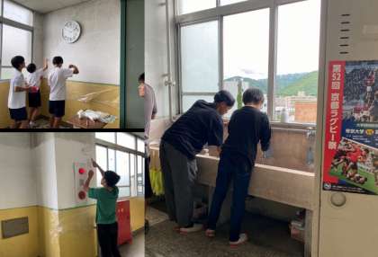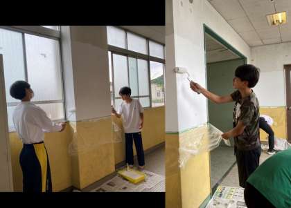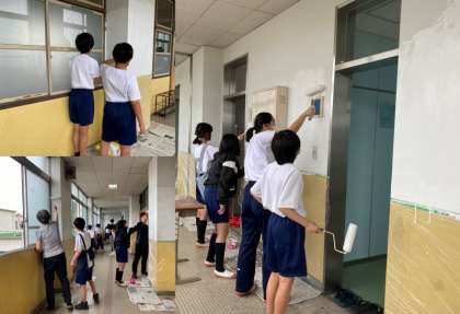 汚れてもいい服装に着替え、エプロンをつける等の準備が整うと、さっそくペンキ塗りを開始しました。壁に向かって、みんな真剣です。色ムラが出ないよう、刷毛の動かし方に気をつけながら塗り、ときおり離れてチェックします。作業時間はおよそ2時間、協力して、白い部分の壁が、より白く美しくなりました。