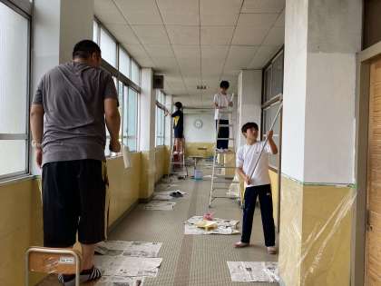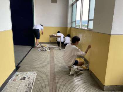 学校での活動組は、廊下と階段の壁のペンキ塗りです。今日は、黄色い部分と白い部分の上部を塗りました。黙々と取り組む様子が、まるで職人のようでした。