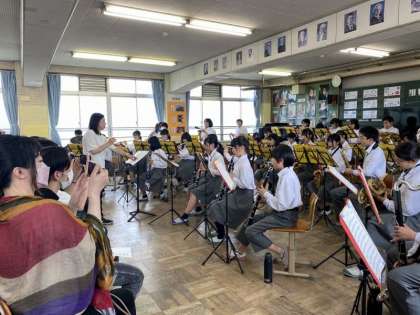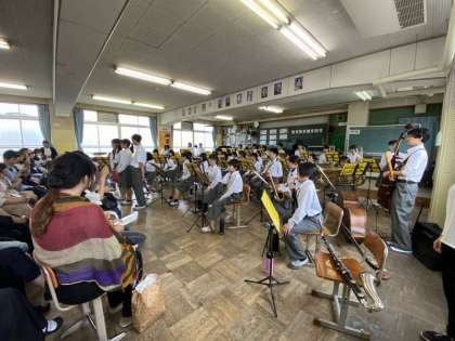 午後には部活動参観が行われました。吹奏楽部では、サマーコンサートを企画しました。会場の音楽室は、入口の扉を外さなければならない程、満席状態。多くの方に演奏を楽しんでもらえました。