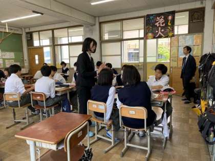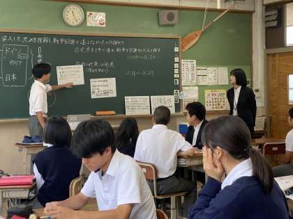3年社会科は「世界大戦に突入した流れを理解し、戦争回避の道はなかったのかを探ろう」というテーマでした。第二次世界大戦に至るまでの出来事を整理した後、「アメリカとの交渉の仕方によって、戦争を回避できたのではないか」という視点で、個々の意見をグループで交流した後、全体で共有しました。難しいテーマでしたが、それぞれが自分の考えを持ち、意見交流しながら、グループの考えを作り、発表していました。