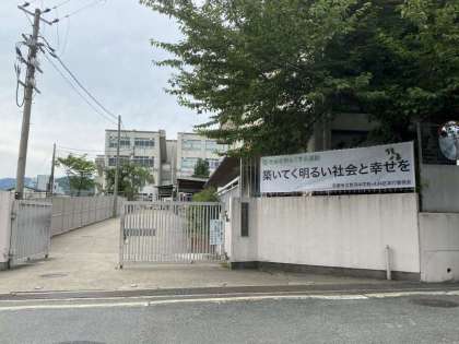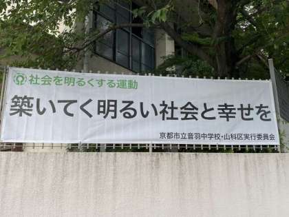 音羽中では、毎年、懸垂幕の掲示をしていましたが、傷みが激しかったため、新しい横断幕を作っていただけるというお話をいただきました。それで、「社会を明るくする運動」標語を、全校募集し、選ばれた代表標語の入った新しい横断幕が、今、正門付近に掲げられています。