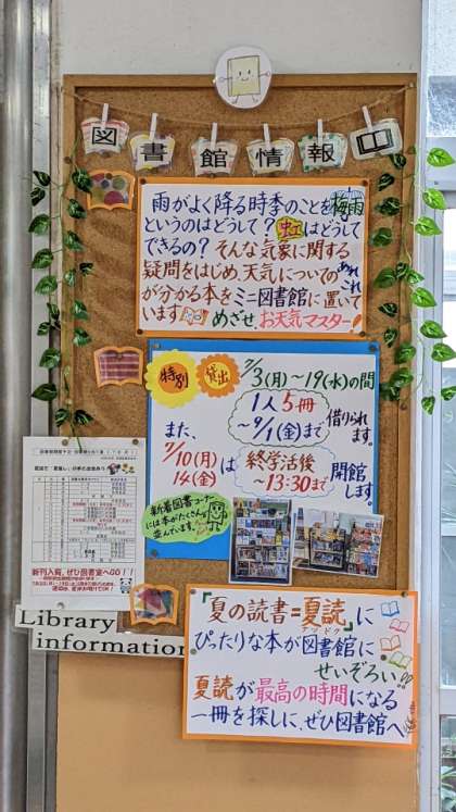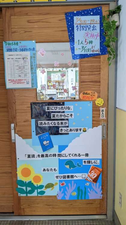 7月19日までは「特別貸出期間」ということで、通常一人2冊のところ、5冊まで借りることができます。(返却は2学期始めです。)また、来週は特別開館を実施する予定です。