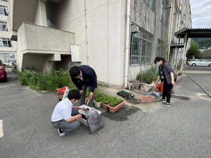 7月7日3、4限、家庭科の授業で藍染めに挑戦しました。藍染めに用いる植物の「藍」を育て、成長した藍の葉を使って染色しました。子どもたちは、家庭科の先生と担任の先生と共に、この日のために、愛情いっぱいに藍を育てて、準備してきました。写真は、プランターで藍を育てる様子です(6月5日撮影)。