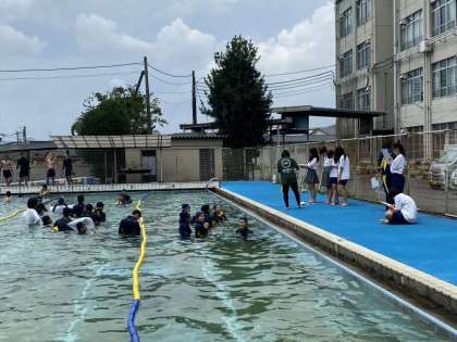 3年生体育では、「着衣泳」を行っています。通常、水着で入るプールに、体操服で入ると、服が水で重くなります。このような「非常時」を体験し、学ぶことで、いざという時に落ち着いて行動できるようにするための学習です。