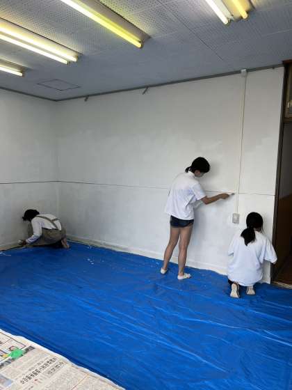写真は、下地塗りの様子。広い面はローラーで、細かい所は刷毛を使って、丁寧に下地を塗ります。暑い中、がんばって取り組み、きれいな下地が完成しました。