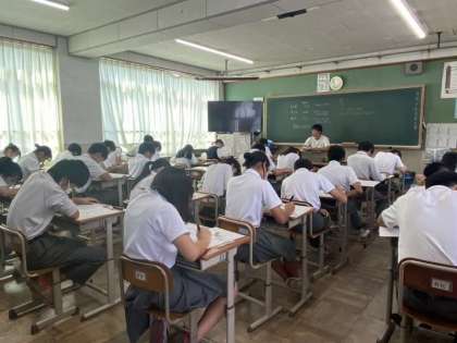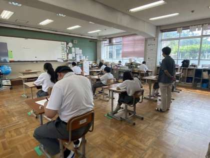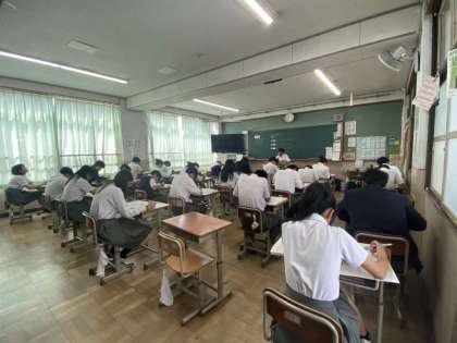 テストが始まると、教室全体に緊張感が漂い、それぞれ無心に問題に取り組みます。2年生は社会・英語・数学、3年生は社会・英語・理科、10組は理科・国語・数学の3教科のテストが行われています。最後まであきらめず、持てる力を発揮してください。