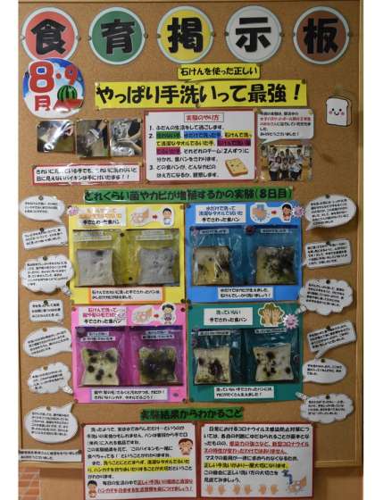職員室前には食育掲示板があります。8・9月のテーマは「やっぱり手洗いって最強」です。