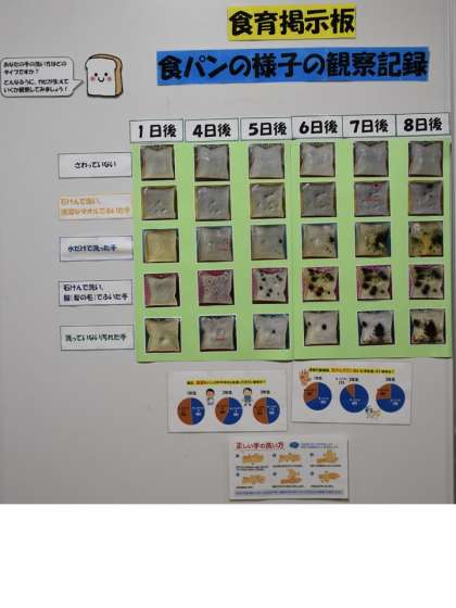 女子バスケットボール部の2年生の皆さんに協力していただき、「洗わない手」「水だけで洗った手」「石鹸で洗って清潔なタオルでふいた手」「石鹸で洗い服でふいた手」の4つのパターンで食パンを触ってもらい、カビの繁殖具合を実験しました。