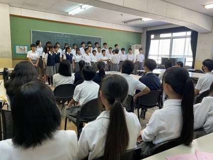 9月29日(金)6限,合唱コンクール本番に向けて,どのクラスも練習に熱が入っています。教室,廊下,階段などのスペースを使って,基本のパート練習をしっかり行います。自主合同練習を企画し,互いの合唱を聞きあったクラスは,双方にとって,得るものがあったようです。音程を正確にとるため,わざと離れて歌うなど,それぞれ工夫して練習していました。一様に熱いものが伝わってくるここ数日です。体調を整え,万全の状態で本番の日を迎えてください。