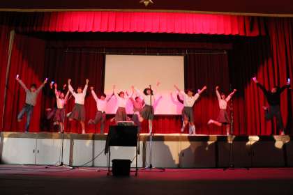 オープニングの様子です。生徒会本部メンバーと7人の教職員のダンスで一気にテンションが上がります。その後、生徒会本部によるパフォーマンスがあり、会場がさらに盛り上がりました。