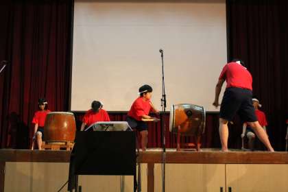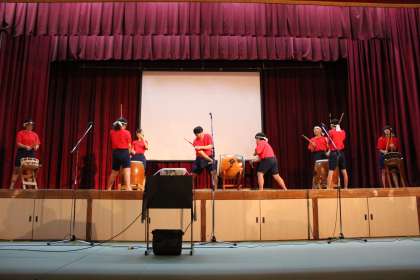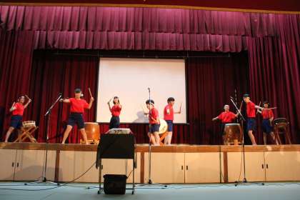 「音羽太鼓」のステージが始まりました。少し緊張した面持ちでしたが、演奏が始まった途端、夢中に演奏する10組メンバーです。赤い衣装が映える中、たくましい和太鼓の音が鳴り響きます。かけ声も大変迫力があり、最高の演奏でした。