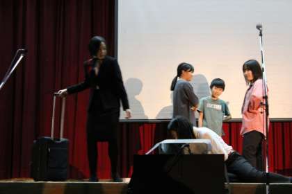 演劇部「合コンへ行こう」の発表です。声の大きさ、セリフの言い回しが「さすが演劇部!」です。キャストと裏方が作り上げる世界に、あっという間に引き込まれていきます。長いセリフも平気、面白おかしいストーリーに爆笑の場面あり、すばらしい熱演でした。