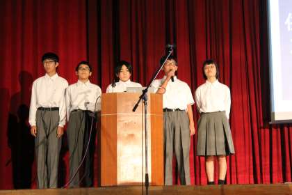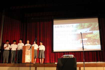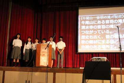 1年生発表は、地域調査です。各クラスの代表班が、パワーポイントを使って発表しました。調査をもとに作った3択クイズが大うけで、観客も一緒に盛り上がります。
