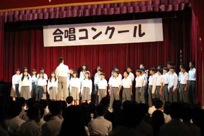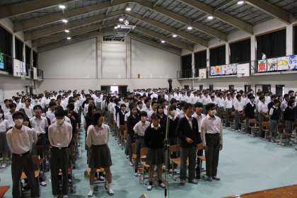 文化委員長のあいさつの後、校歌での声出しと、発声練習を行い、コンクールが始まりました。