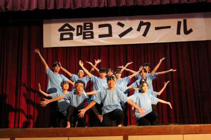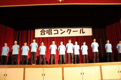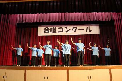 エンディングの様子です。「『開花 〜咲き誇れ 個性の花〜』 コロナ禍の様々な制限により、思うようにできないことも多かった。でも、こうして最後に、全校一斉の素晴らしい文化発表会・合唱コンクールを行うことができた。」「それは、ここにいる一人一人の努力によるもの。今、音羽中には個性の花が咲き誇っている。」「1,2年生の皆さん、この音羽中の伝統を引き継いでいってください。」大きな拍手がわき起こりました。