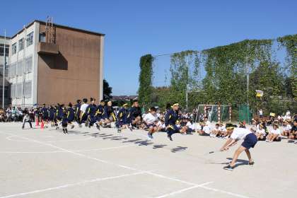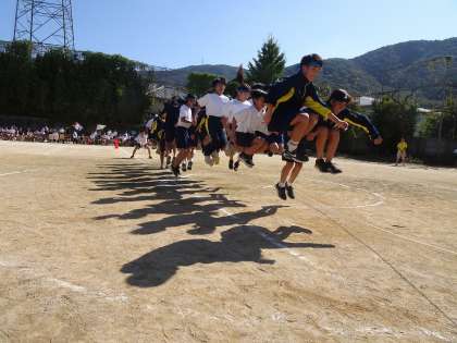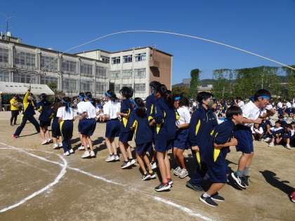 色別種目「ロープジャンプX」です。1年生から3年生までがそろって、青色・赤色・黄色の三色で競う色別対抗競技。