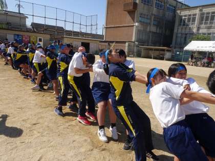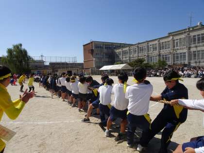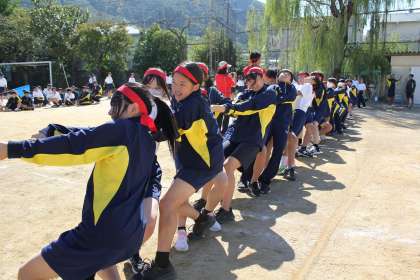 色別種目の「綱引き」です。かけ声とともに、力いっぱい綱を引きます。応援も真剣です。旗を大きく振って、みんなで声を枯らして応援しました。