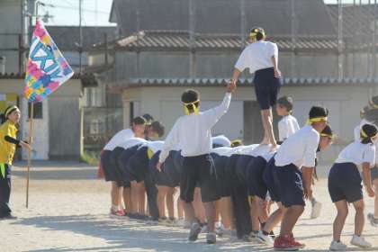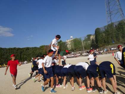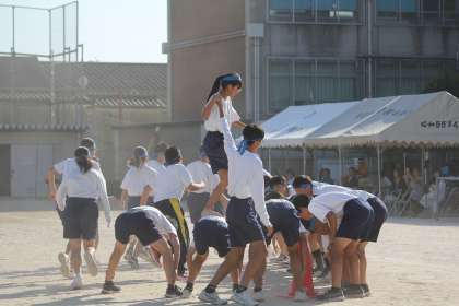 2年学年種目「背渡り上手」。バランス感覚と、チームワークが大切です。どのクラスも大健闘でした。
