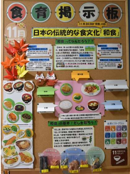 職員室前には食育掲示板があります。11月のテーマは、日本の伝統的な食文化「和食」です。