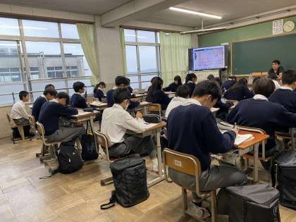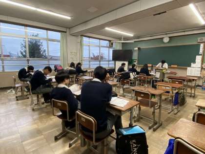 2年生は、教科ごとに教室が分かれ、静かに学習しています。社会科の教室は、教室いっぱいの生徒が、先生の説明を聞きもらすまいと、メモを取ったりアンダーラインを引いたり、集中して取り組んでいました。