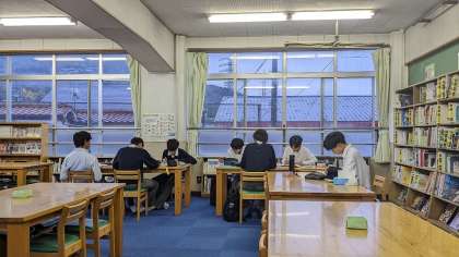 3年生の教室は、数名のグループごとに、必要最小限に教え合いながら、静かに学習します。普通教室以外に、図書室で学習する生徒もおり、それぞれ必死な思いが伝わってくる雰囲気でした。(図書室では、1年生も学習していました。)