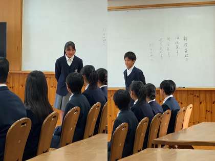 初めに、旧生徒会から一言ずつ言葉がありました。「初めは不安で、何をしてよいかわからなかった。」「がんばって乗り越えたら、とても楽しかった。」「ここまで頑張れたのは、仲間がいたからです。ありがとう。」そして、新生徒会への激励がありました。