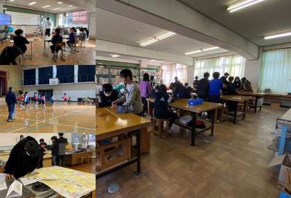 体育は,急きょ体育館での授業でしたが、お互いに自己紹介を行った後、バスケットボールを体験しました。技術の「タワーグランプリ」では、協力して出来るだけ高いタワー制作に挑戦しました。家庭科では、身体に装着するものによって「高齢者体験」を行いました。育成では,細長いビニール袋でロケットを作り、飛距離を伸ばす工夫を試行錯誤しました。どの授業も、みんな積極的に取り組んでいました。