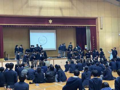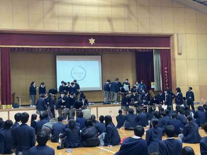 集会最後に、クラス対抗豆つかみ大会を実施しました。今日の大会に向けて、朝練・昼練で鍛えたクラスもあるくらい、スタート前から、みんなの高揚した気持ちが伝わってきました。クラスの応援を受けて無我夢中で競い合う様子は、勝敗に関係なく、素晴らしかったです。